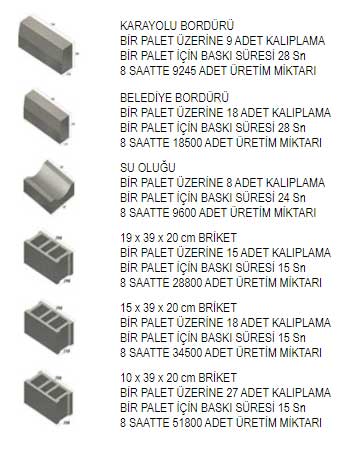 FULL otomatik sistemlerde gerekli tesis alanı: Minimum 5500 m2 ( Makine ve ekipmanları için 800 m2, kurutma alanı 1800 m2, kuru hazır ürün depolama alanı 1600 m2, agrega depolama alanı 1000 m2, boş palet bekletme alanı 300 m2) FULL otomatik sistemlerde kurulması gerekli toplam transformator veya jenerator gücü 250 kVA olmalıdır. Tesis kurulu gücü 160 kwsaattir. FULL otomatik sistemlerde fabrikayı çalıştırmak için gerekli personel sayısı : 2 kişi ( operator ve FORKLİFT)