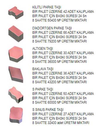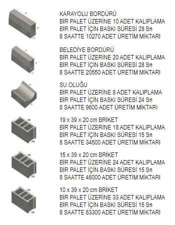 Otomatik sistemlerde gerekli tesis alanı: Minimum 6500 m2 ( Makine ve ekipmanları için 1200 m2, kurutma alanı 2000 m2, kuru hazır ürün depolama alanı 1900 m2, agrega depolama alanı 1000 m2, boş palet bekletme alanı 400 m2) Otomatik sistemlerde kurulması gerekli toplam transformator veya jenerator gücü 200 kVA olmalıdır. Tesis kurulu gücü 125 kwsaattir. Otomatik sistemlerde fabrikayı çalıştırmak için gerekli personel sayısı : 3 kişi (2 operator ve 1 forklift sürücüsü)